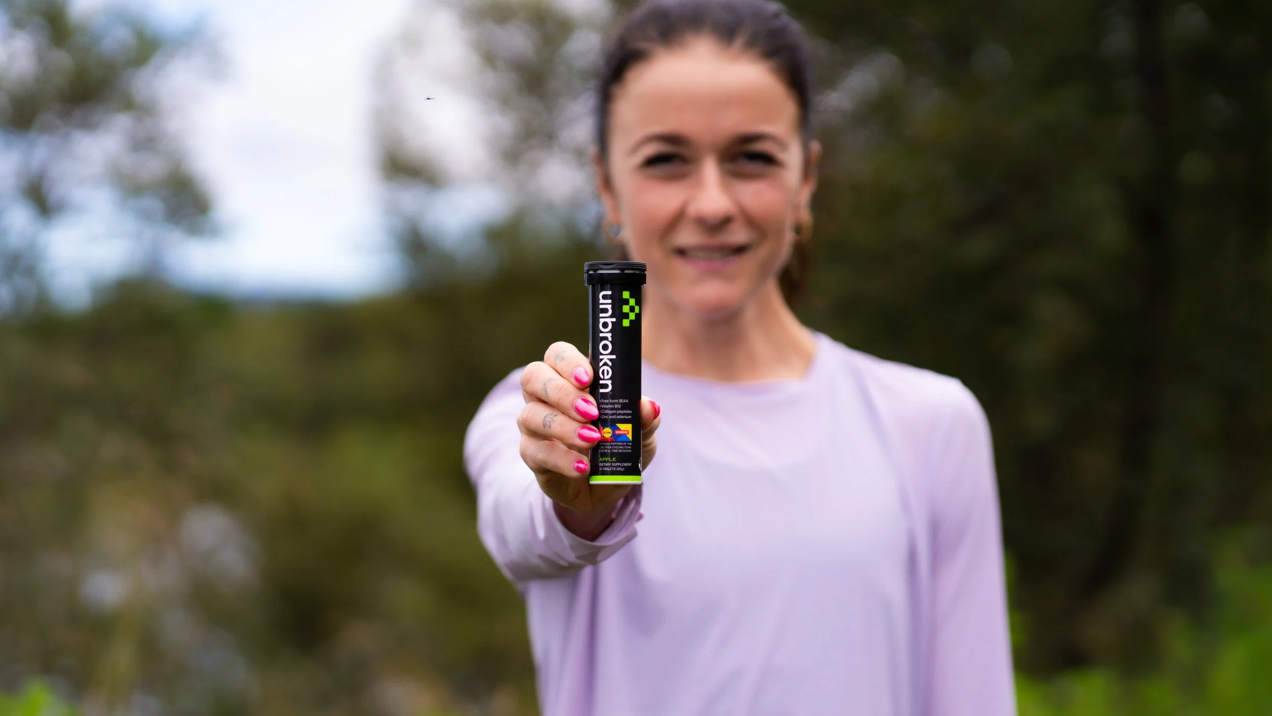 A woman outdoors holding a black tube of Unbroken dietary supplement towards the camera, with a blurred green and brown forest background.