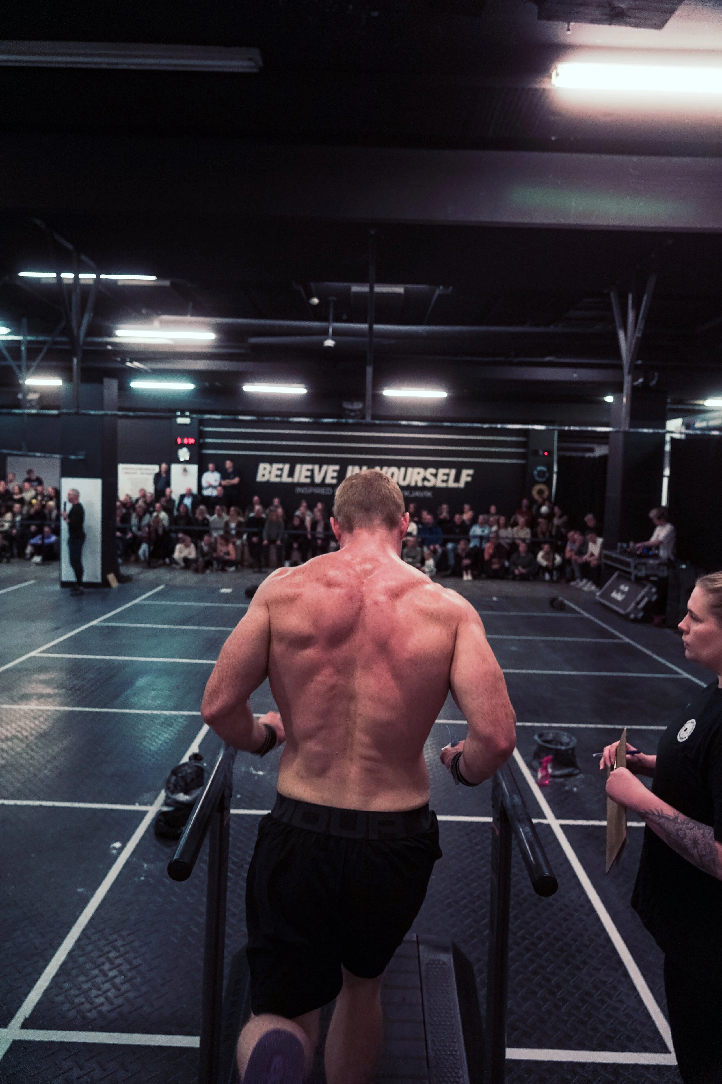 A shirtless man running on a treadmill in a gym with an audience seated in the background.