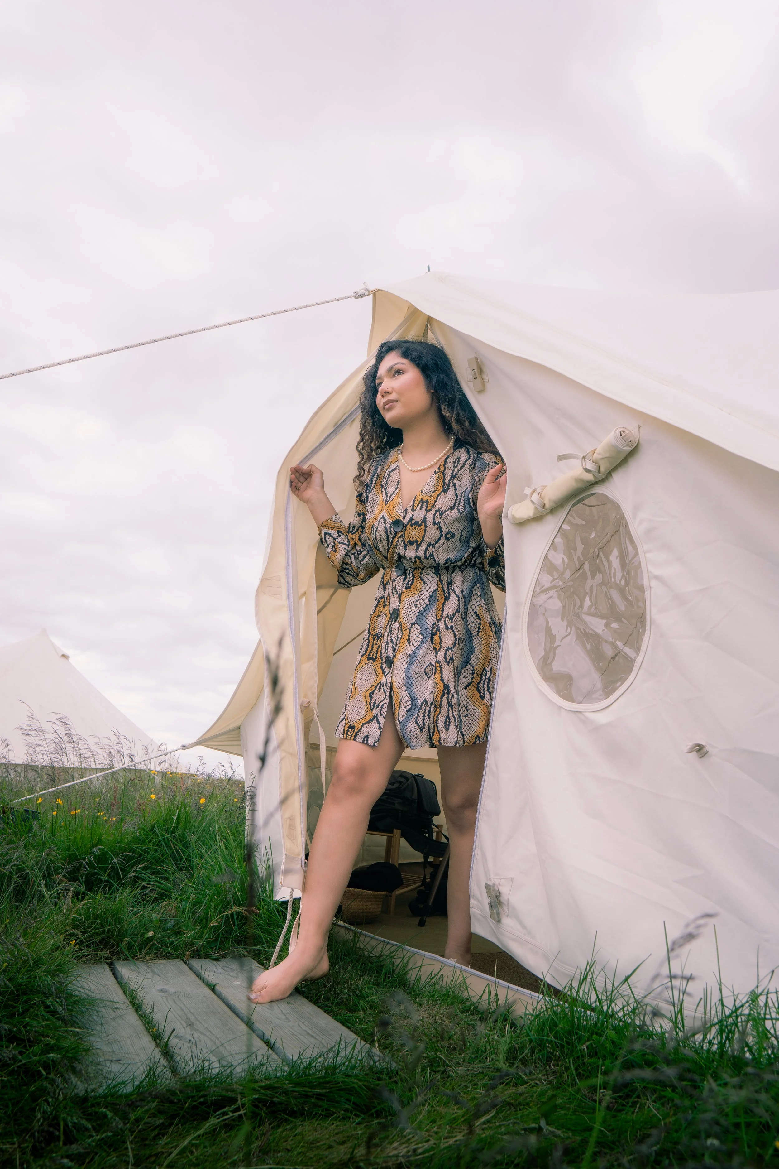 A woman with long curly hair, wearing a patterned dress and pearl necklace, standing barefoot in a grassy outdoor tent, looking off to the side.