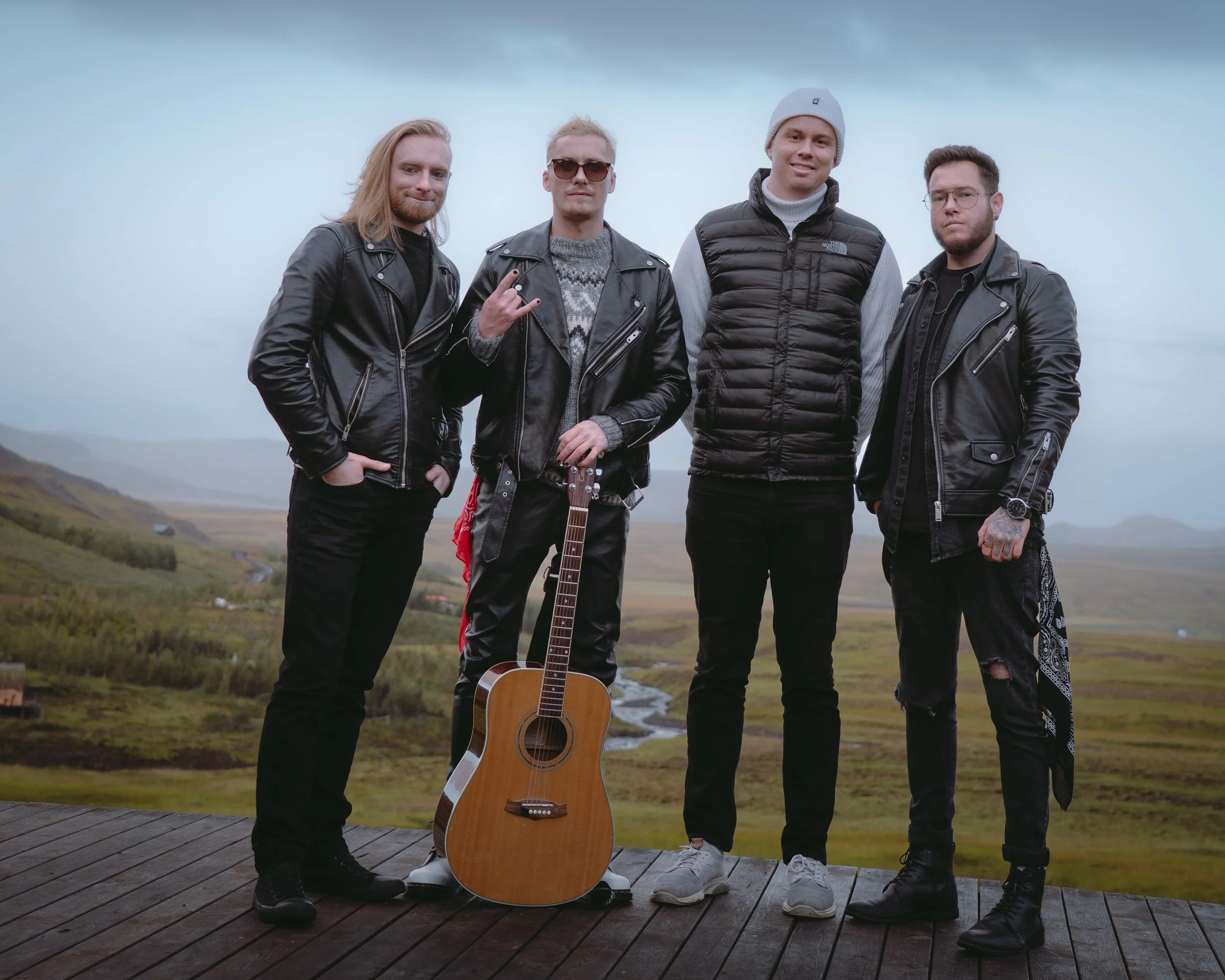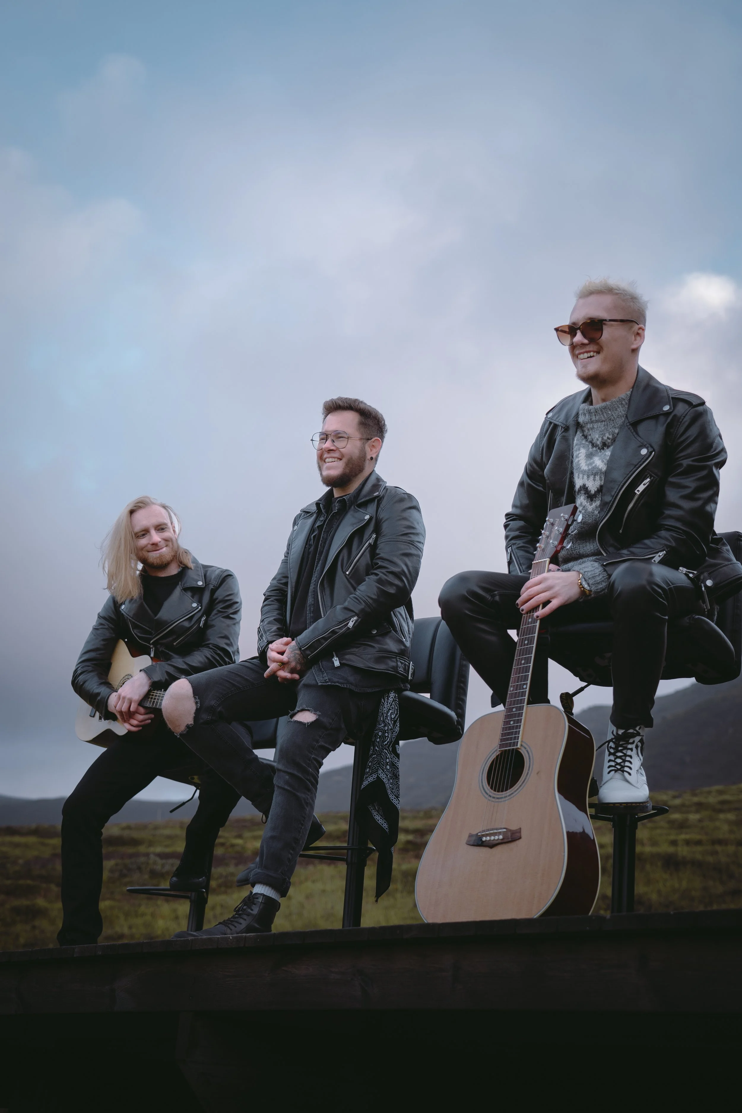 Three young men sitting outdoors with guitars, wearing black leather jackets, smiling, with mountains and cloudy sky in the background.