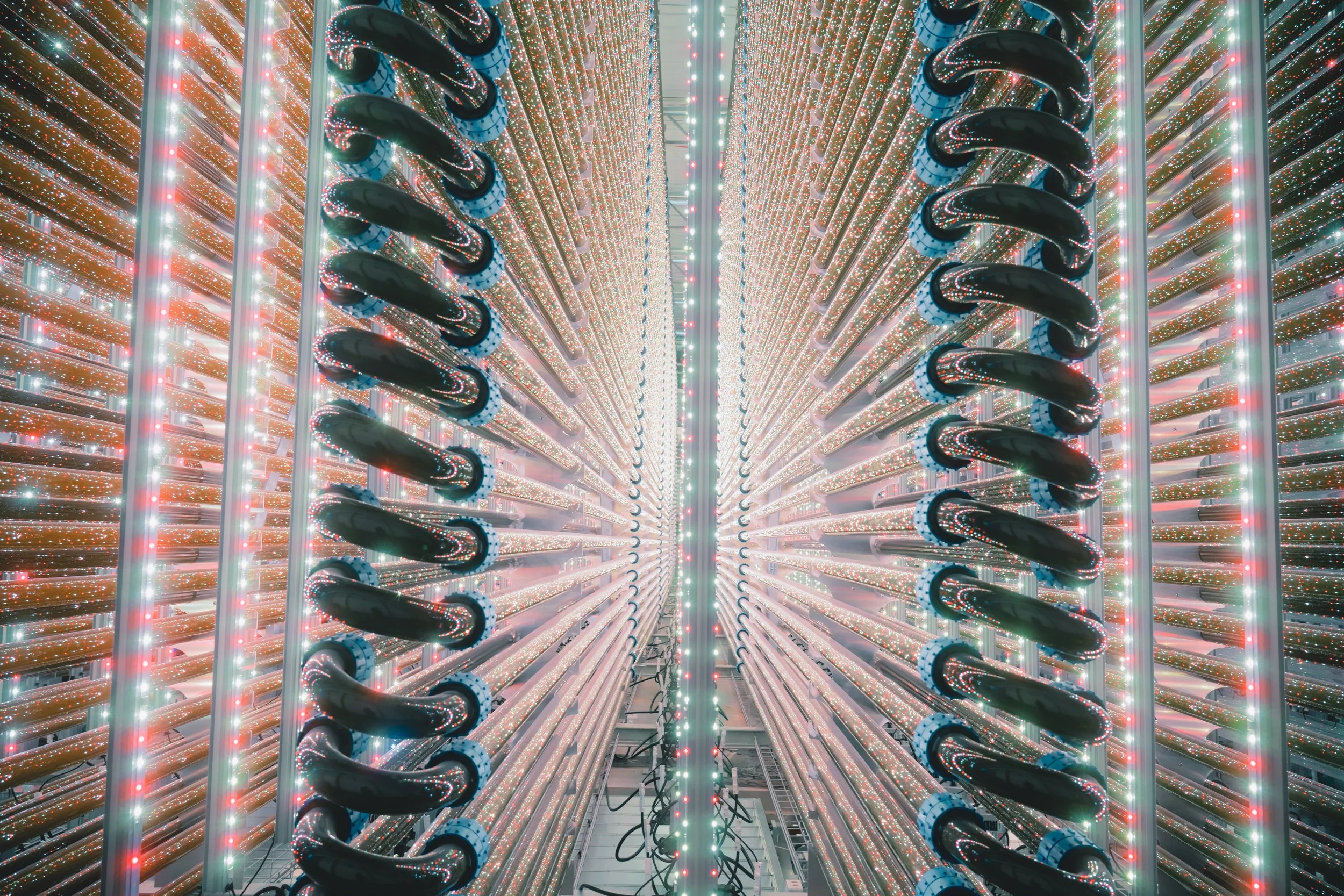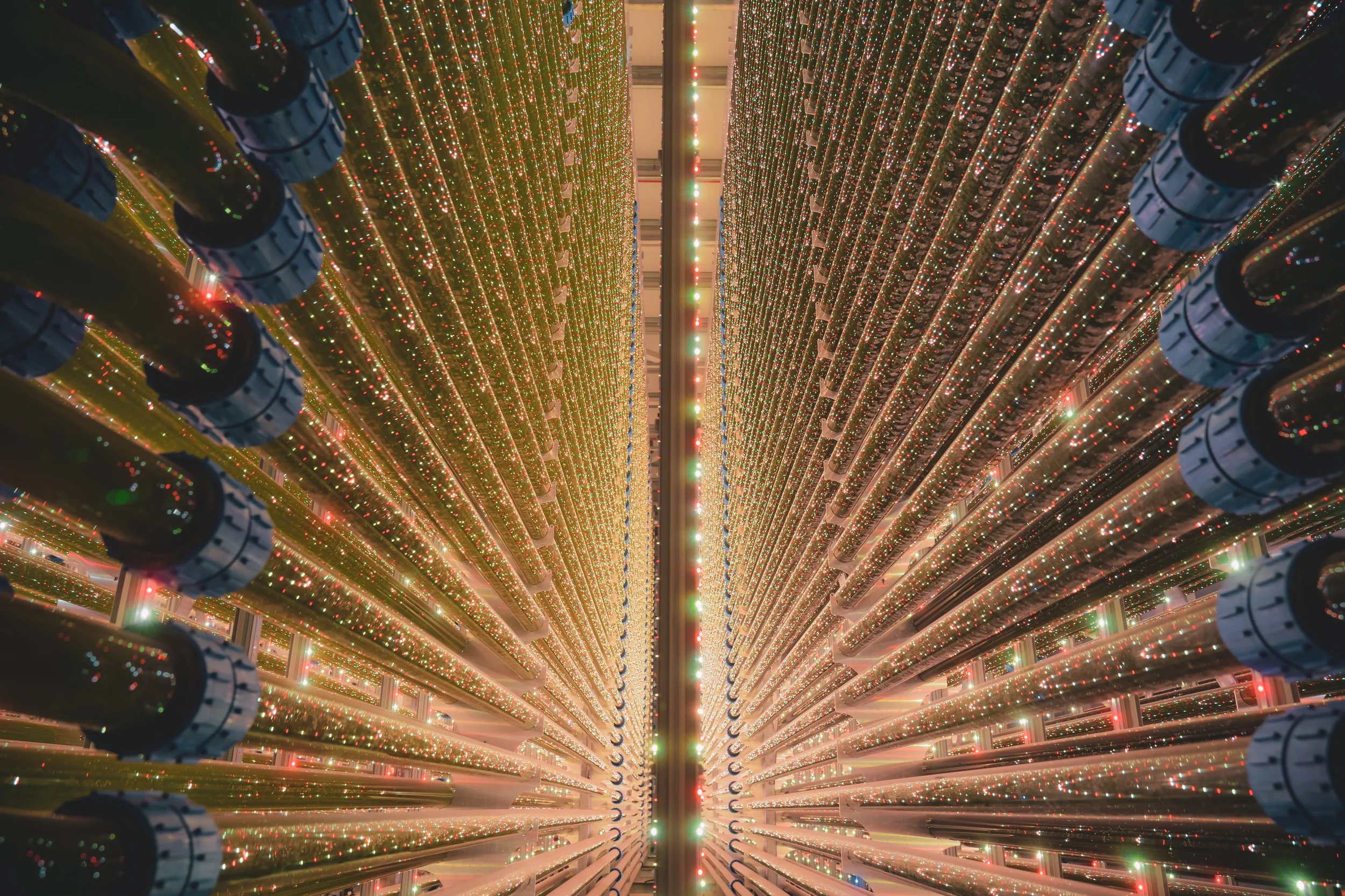 Multiple rows of large water pipes decorated with red, green, and white Christmas lights, ascending into the distance in a warehouse or factory setting.