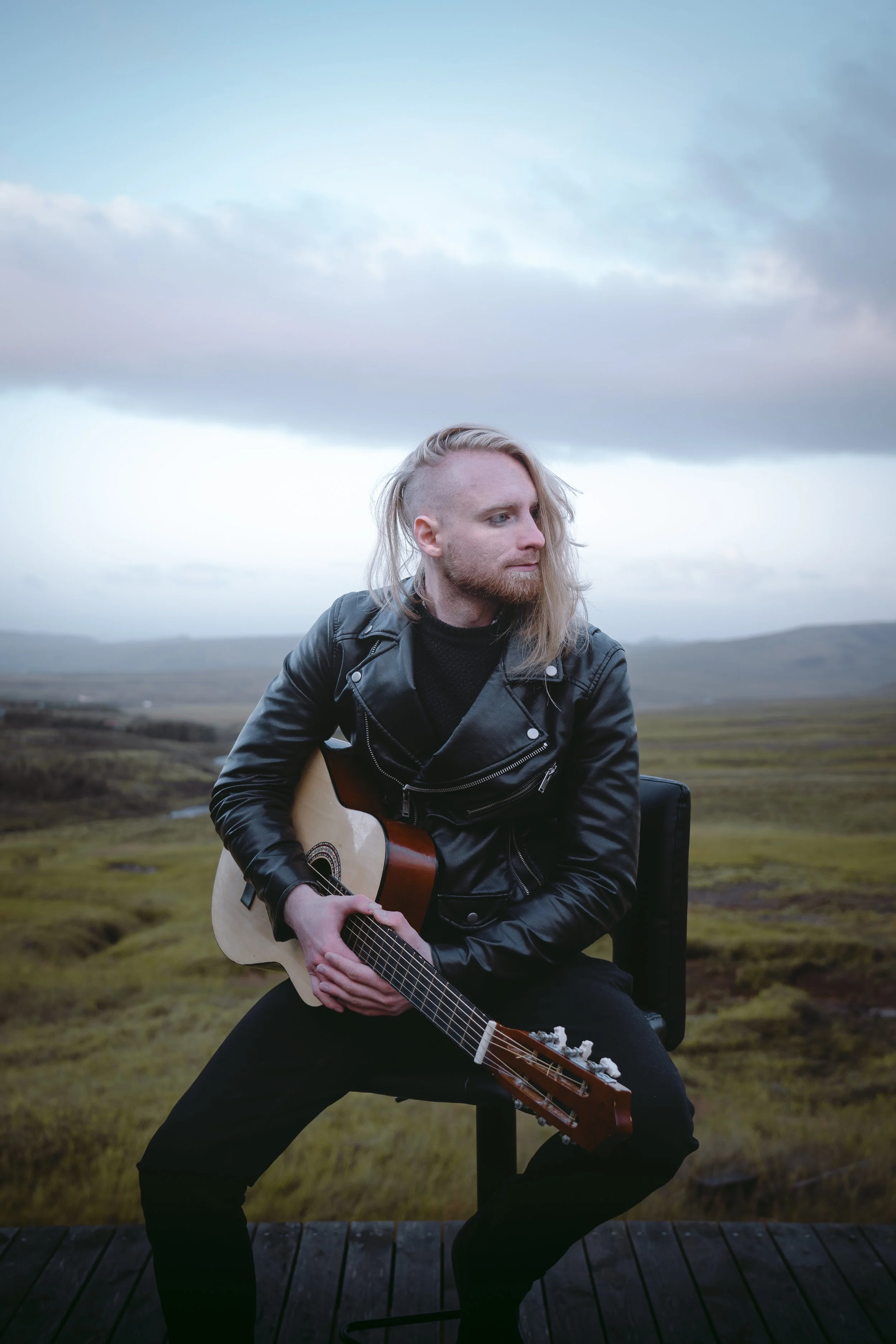 A man with long blond hair and a beard, wearing a black leather jacket, sitting outdoors on a black chair, holding an acoustic guitar across his lap, with a landscape of green fields and cloudy sky in the background.