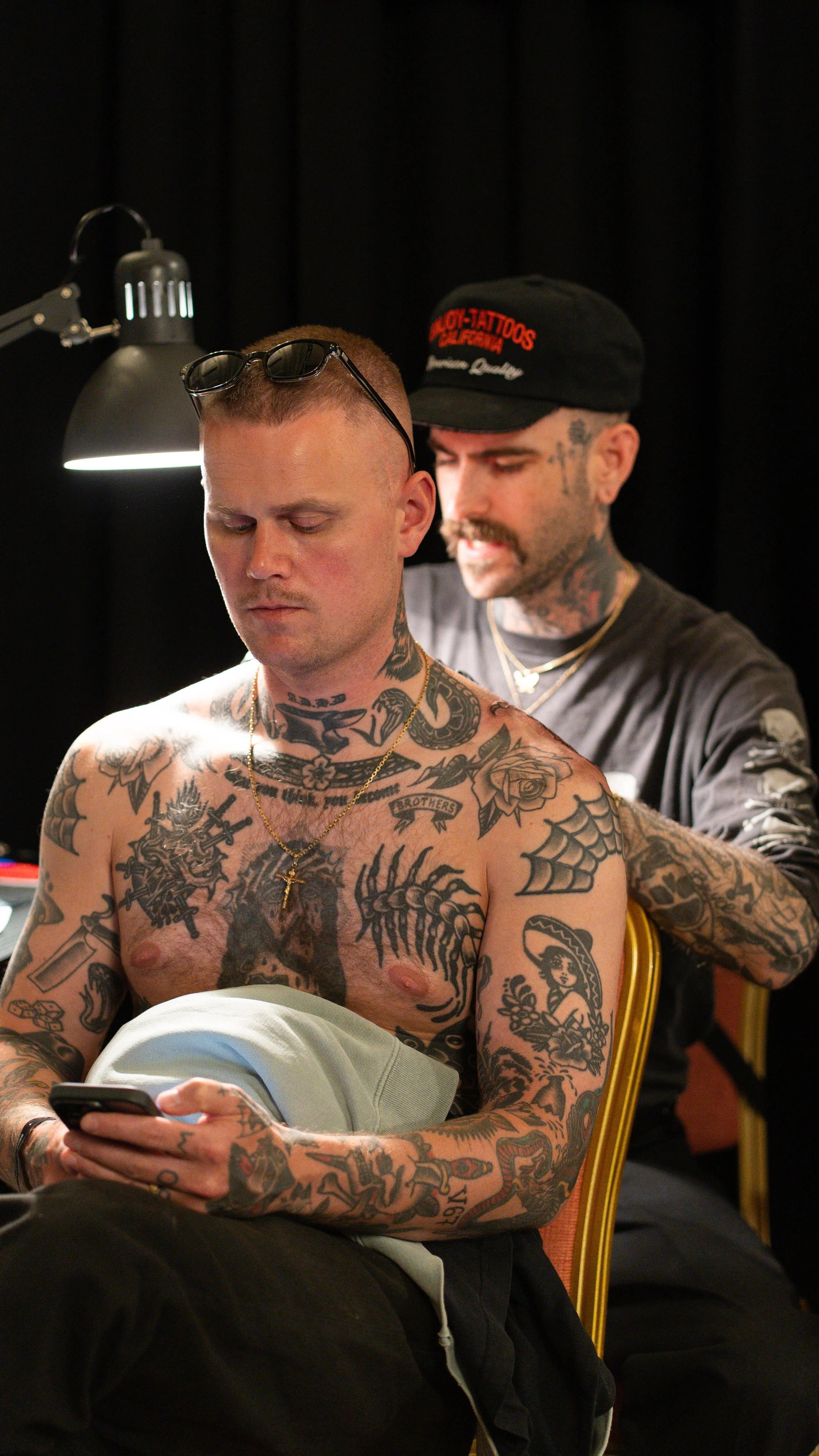 A shirtless man with numerous tattoos is sitting and looking at his phone, while another man with tattoos, a beard, and tattoos on his face is tattooing him. The tattoo artist is wearing a black hat and gray shirt, sitting behind the client. A black