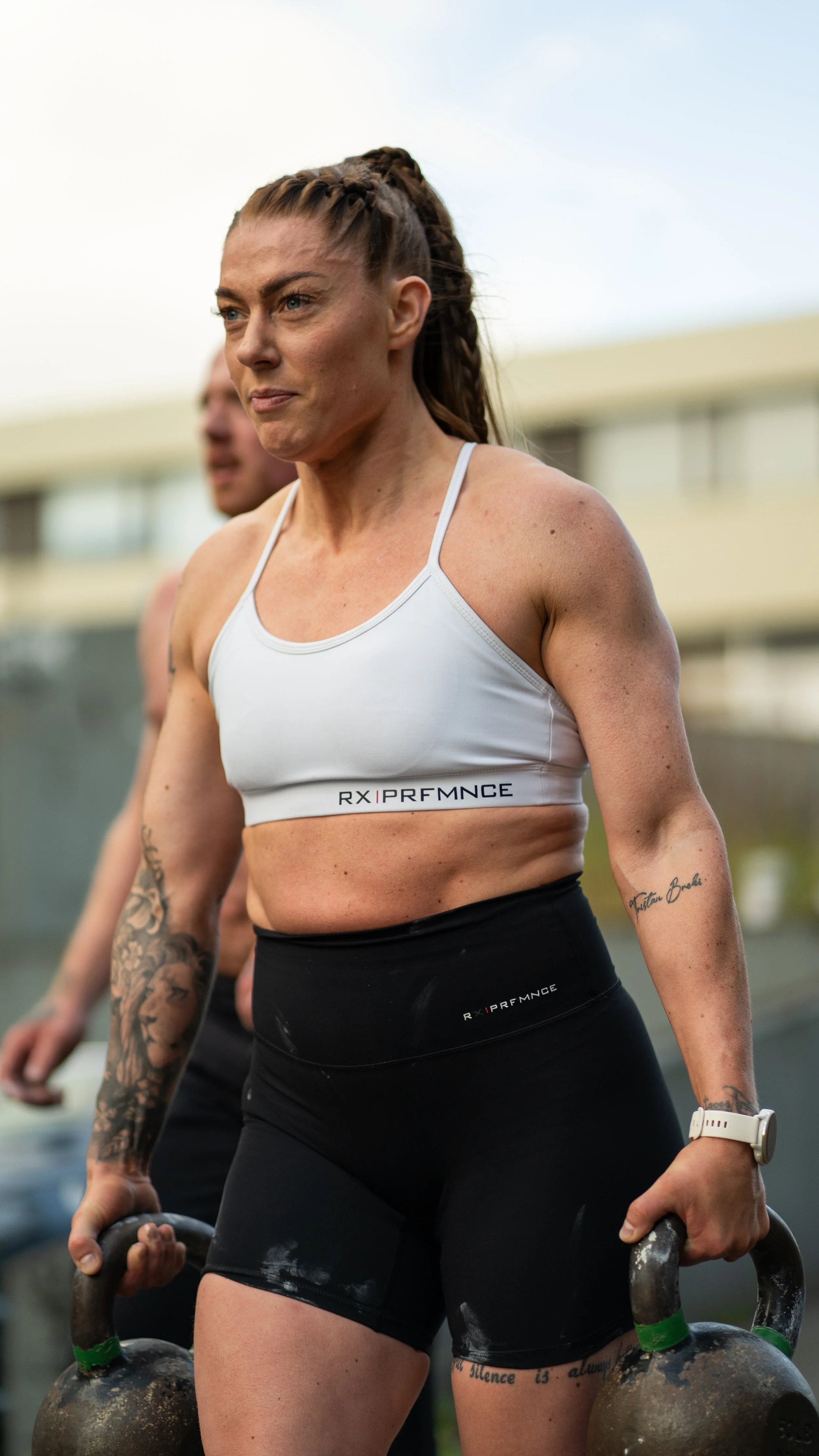 A woman with braided hair lifting kettlebells outdoors, wearing a white sports bra and black shorts.