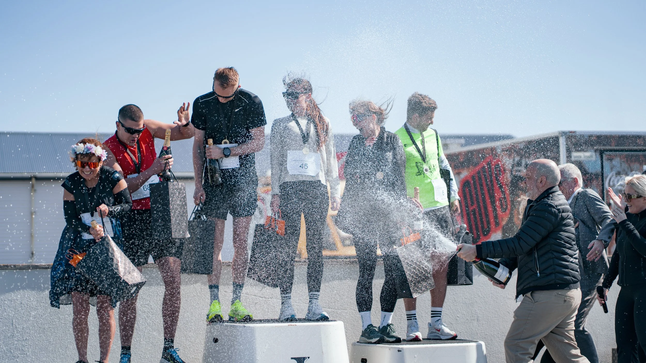 People celebrating on a winners' podium with champagne sprays at an outdoor race event.