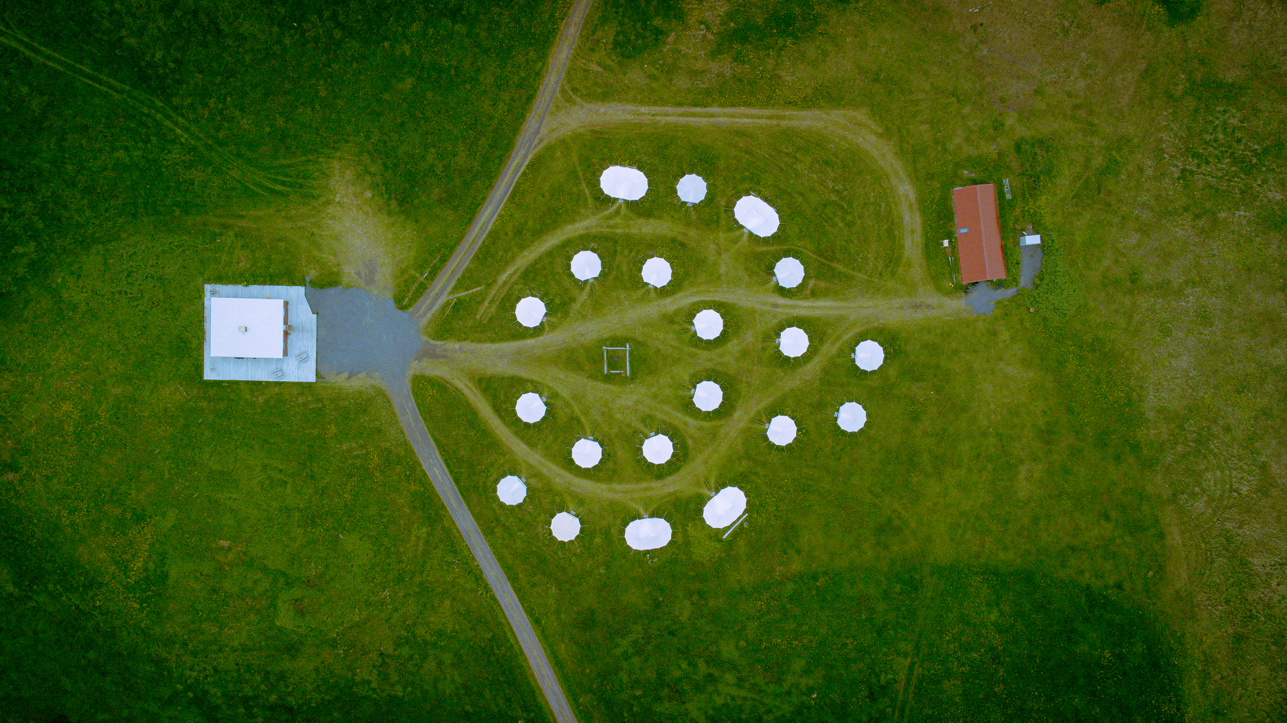 Aerial view of a grassy area with multiple white tent structures arranged in a circular pattern, connected by pathways, with two small buildings on either side of the circle.