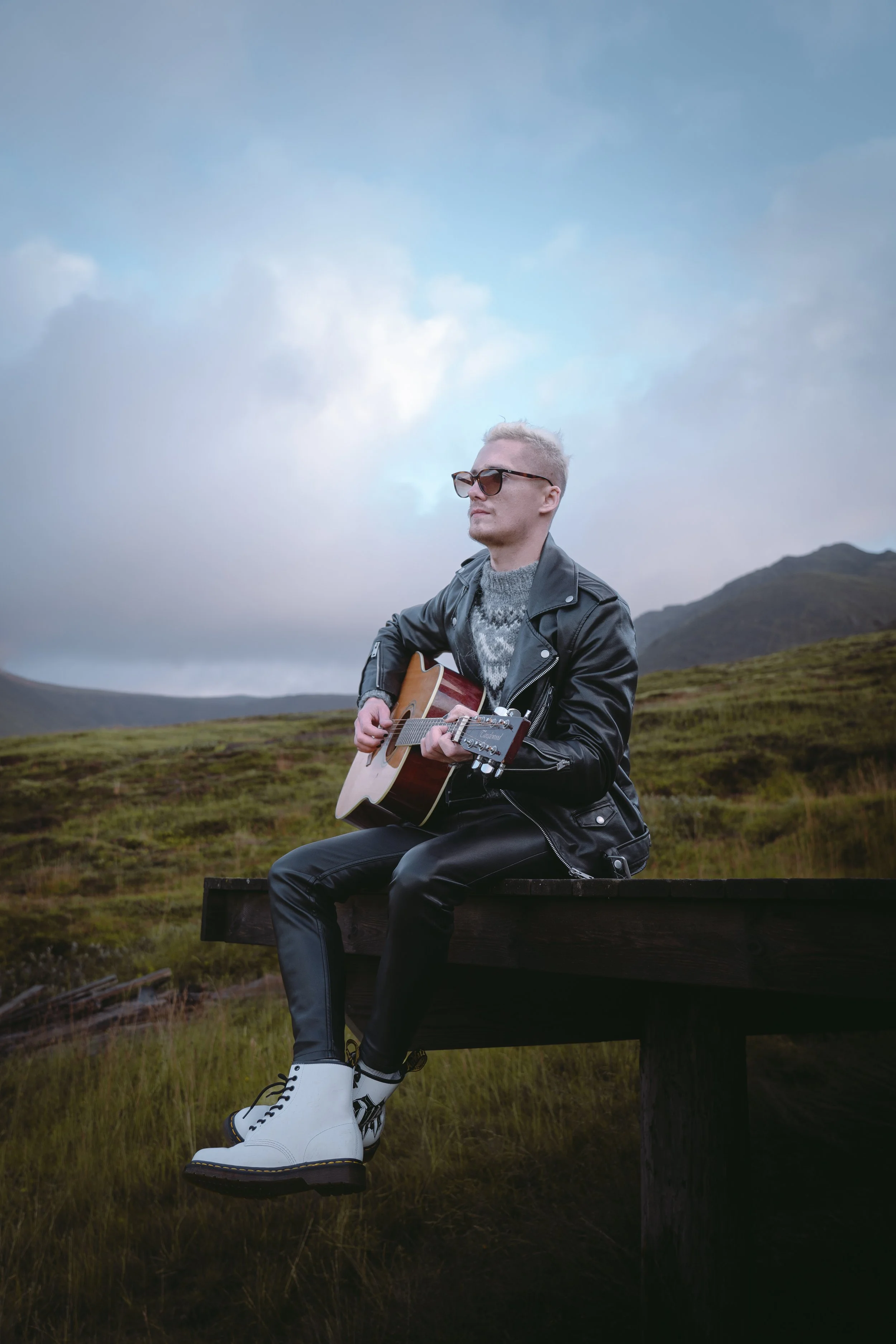 A man with sunglasses and blond hair sitting on a wooden bench outdoors, playing an acoustic guitar with mountainous terrain and a partly cloudy sky in the background.