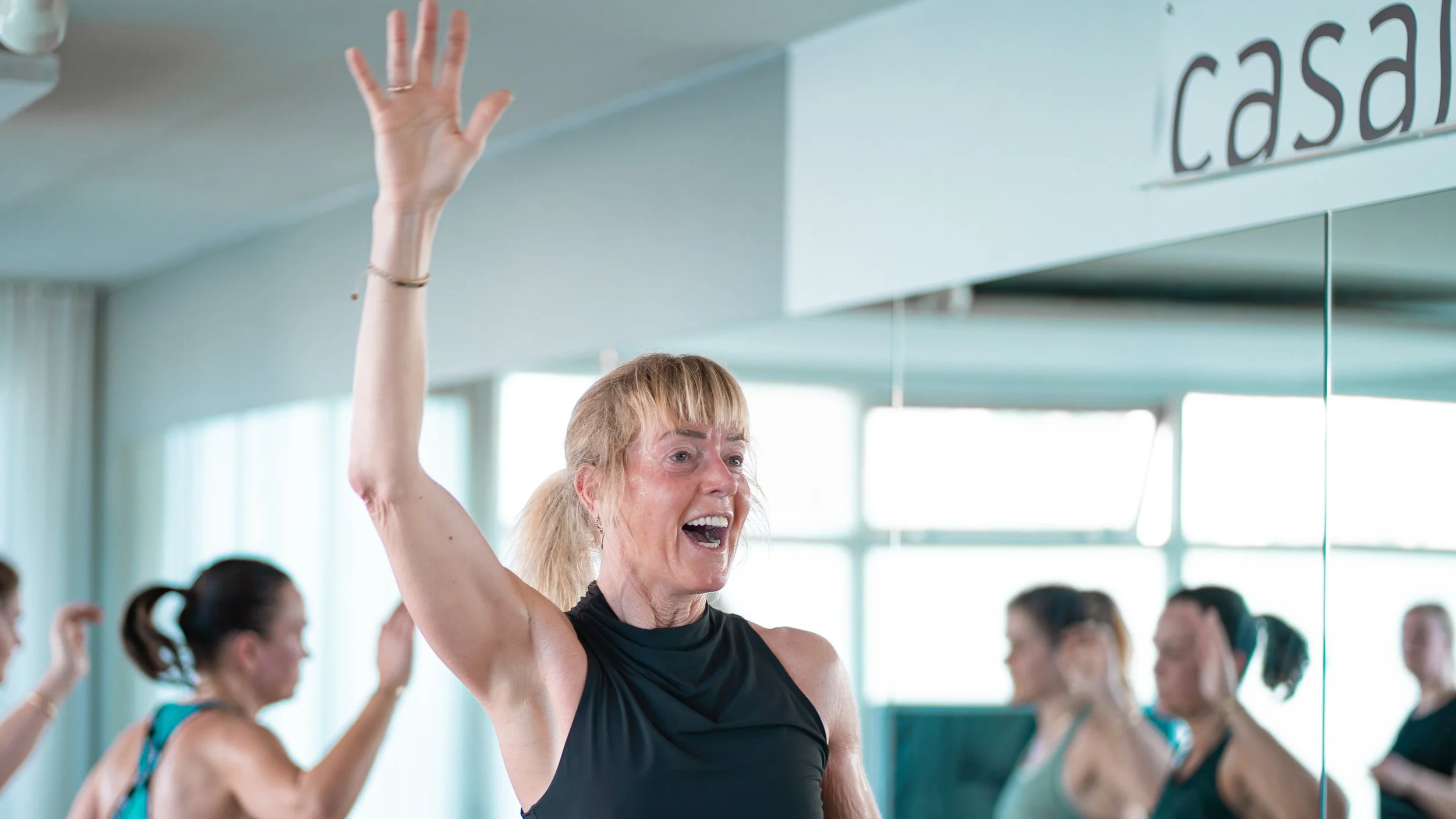 An older woman leading an exercise class in a gym studio, raising her arm and smiling with other women in the background.
