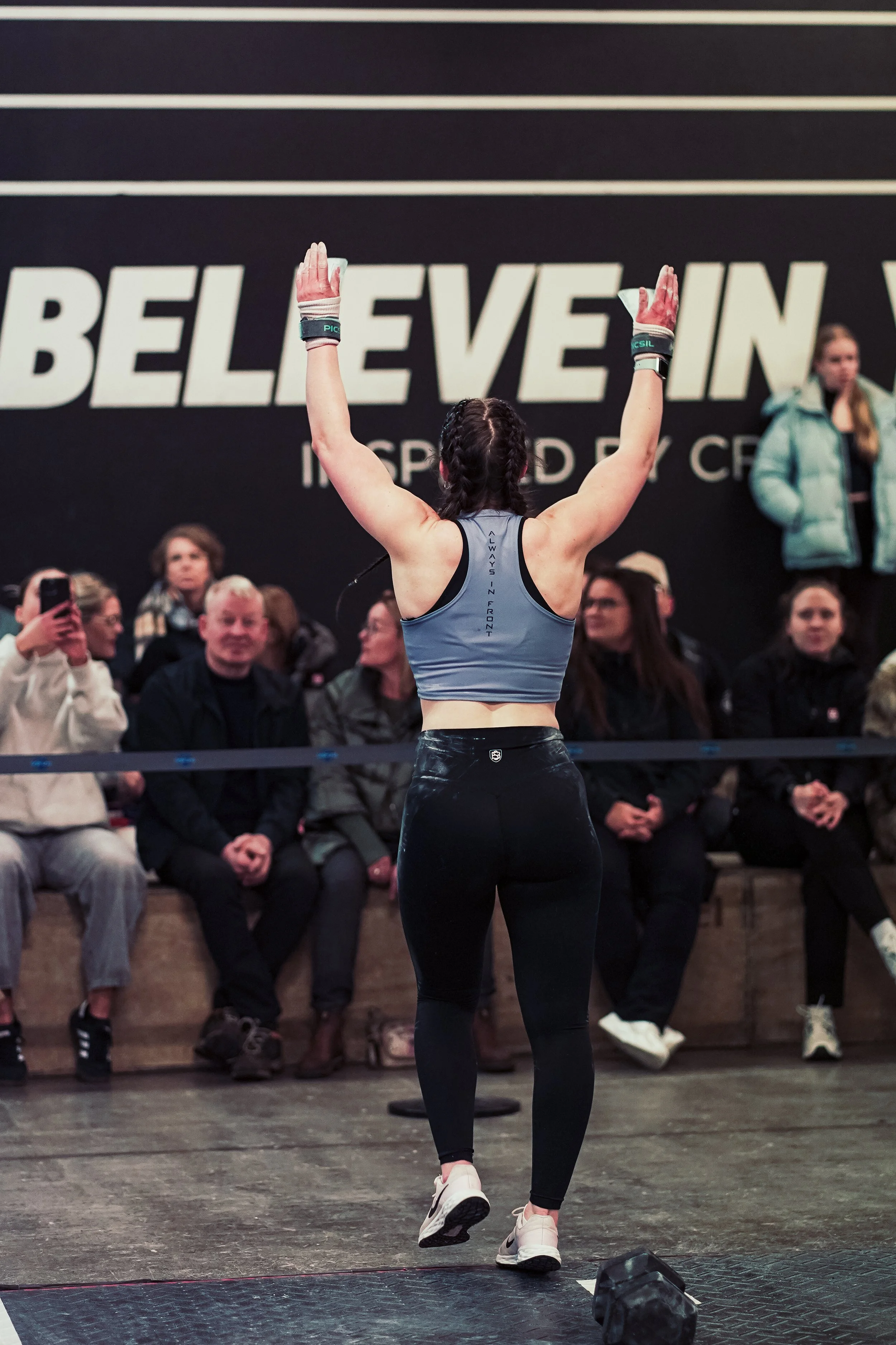 A female athlete with braids wearing a sports bra and leggings raises her arms in front of an audience during a fitness event.