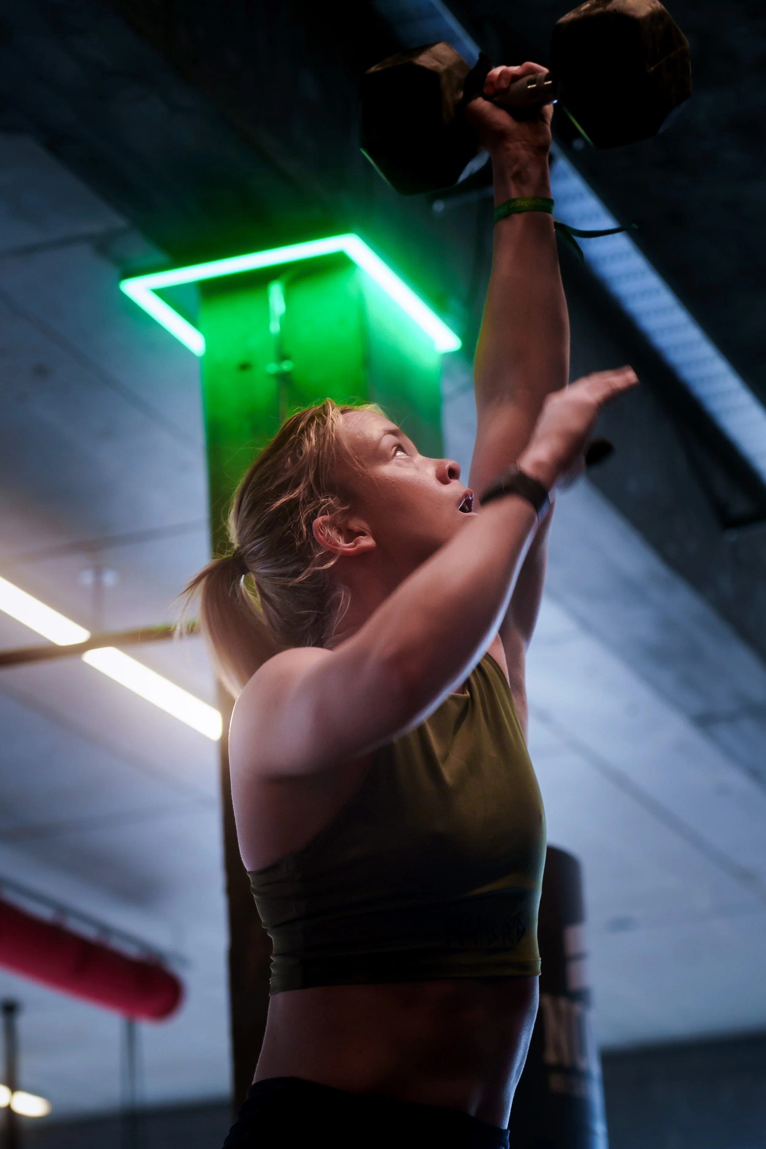 A young woman lifting a dumbbell during a workout in a gym, with neon green lighting overhead.