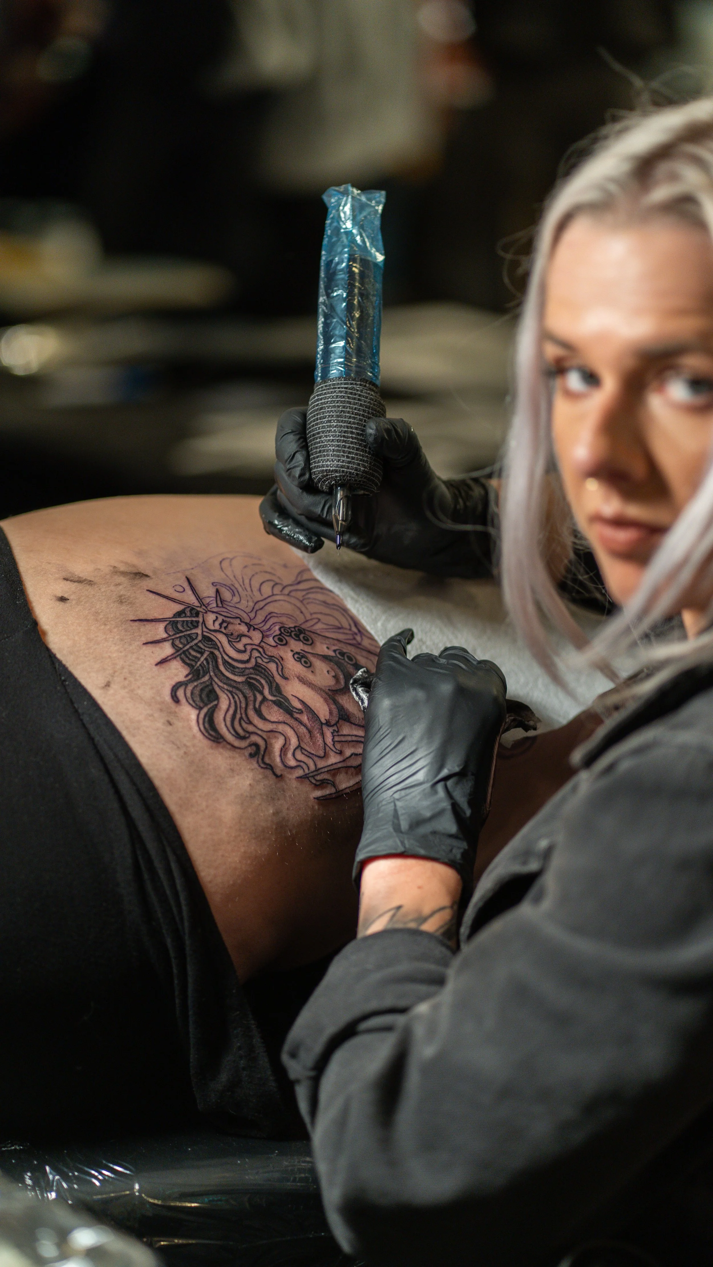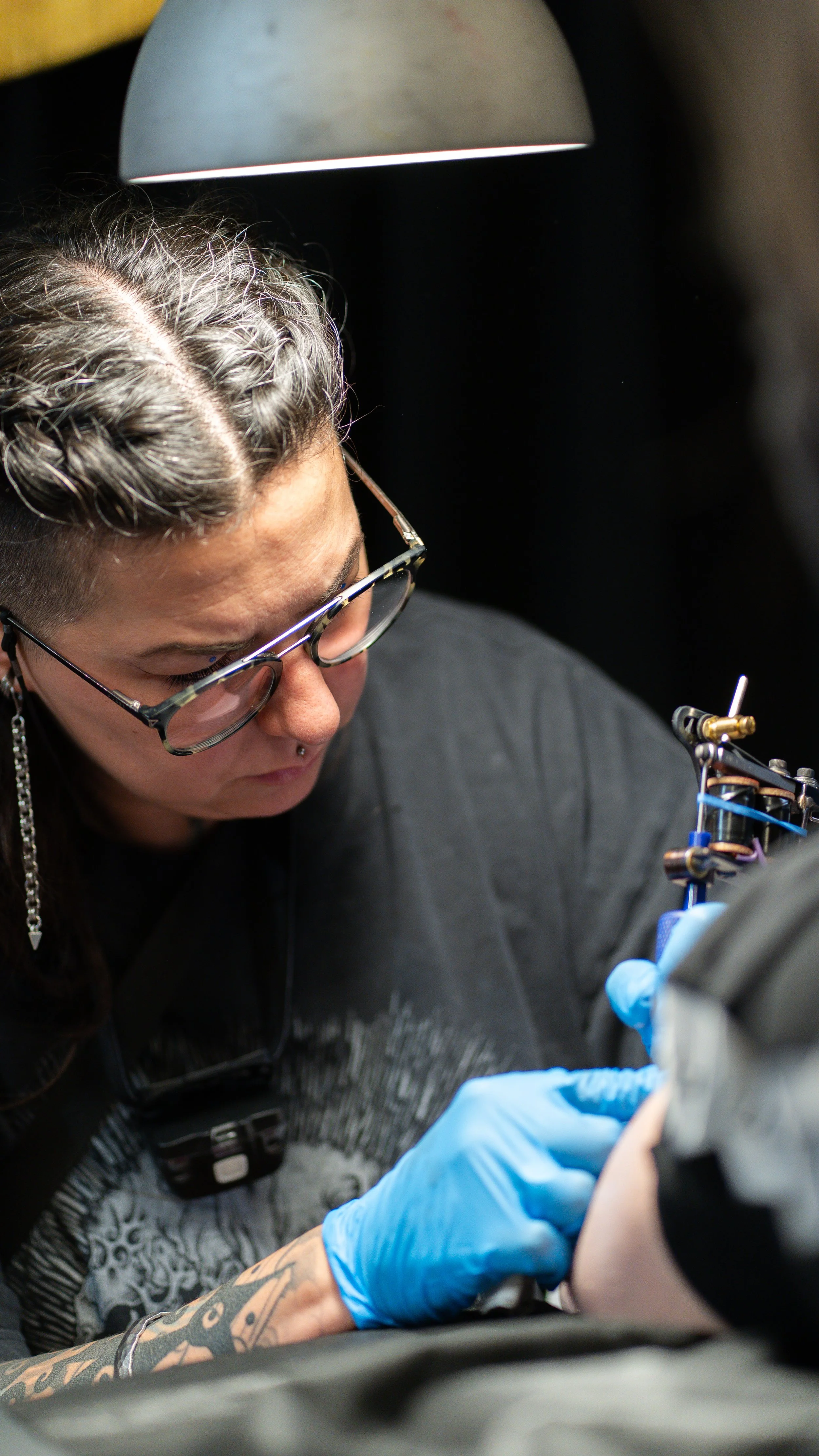 A tattooed woman with glasses and a nose piercing, wearing blue gloves, tattoos, and a black shirt, is focused on her work under a lamp, possibly doing a tattoo.