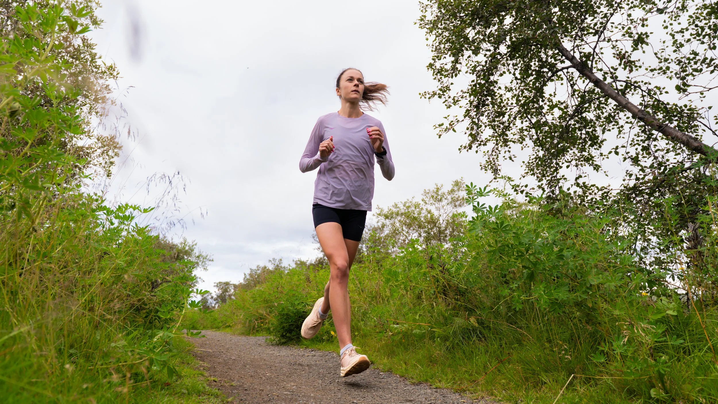 A woman jogging on a dirt trail surrounded by green vegetation and trees, under a cloudy sky.