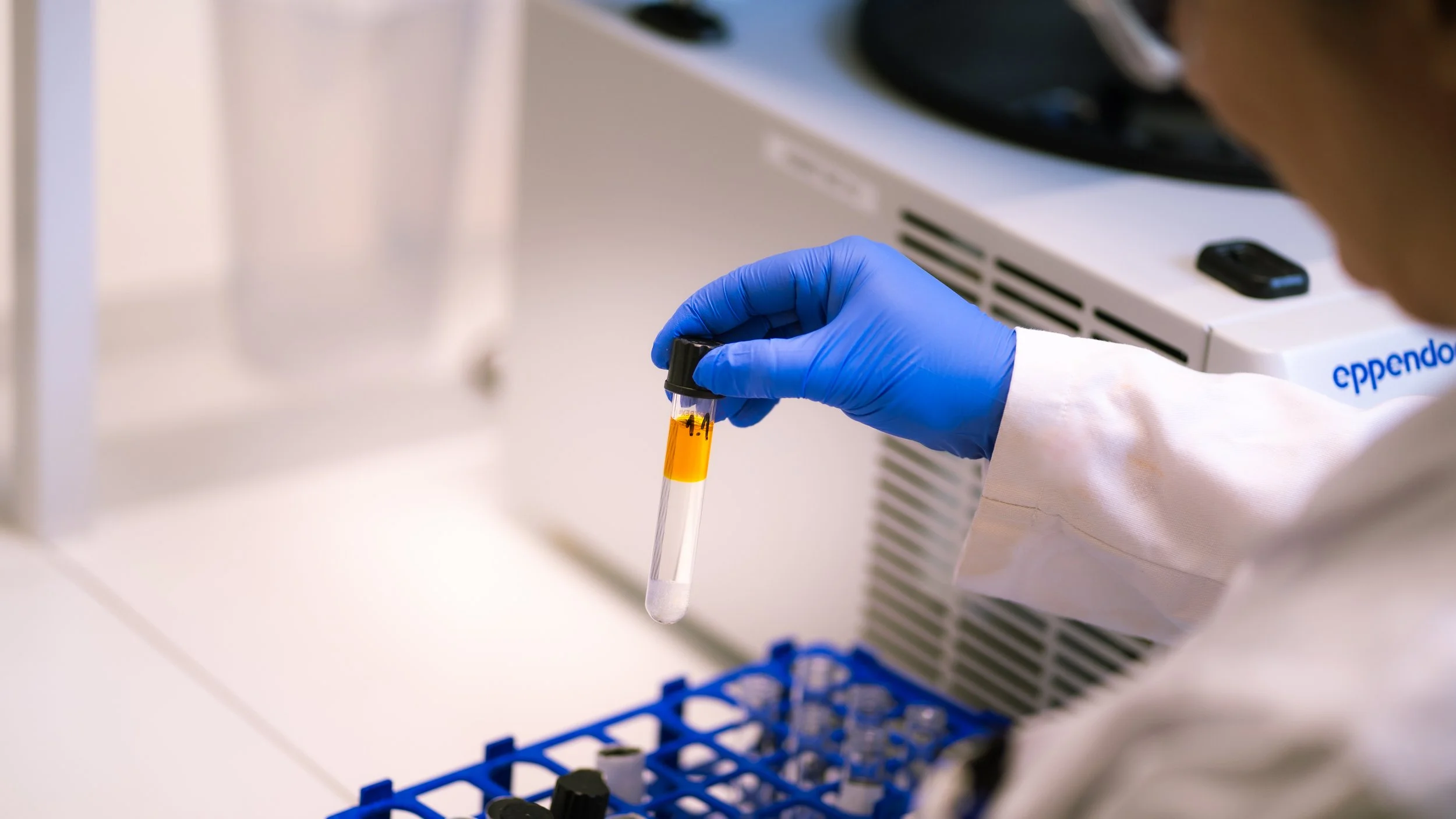 A scientist in a white lab coat and blue gloves holding a test tube with an orange substance inside in a laboratory.
