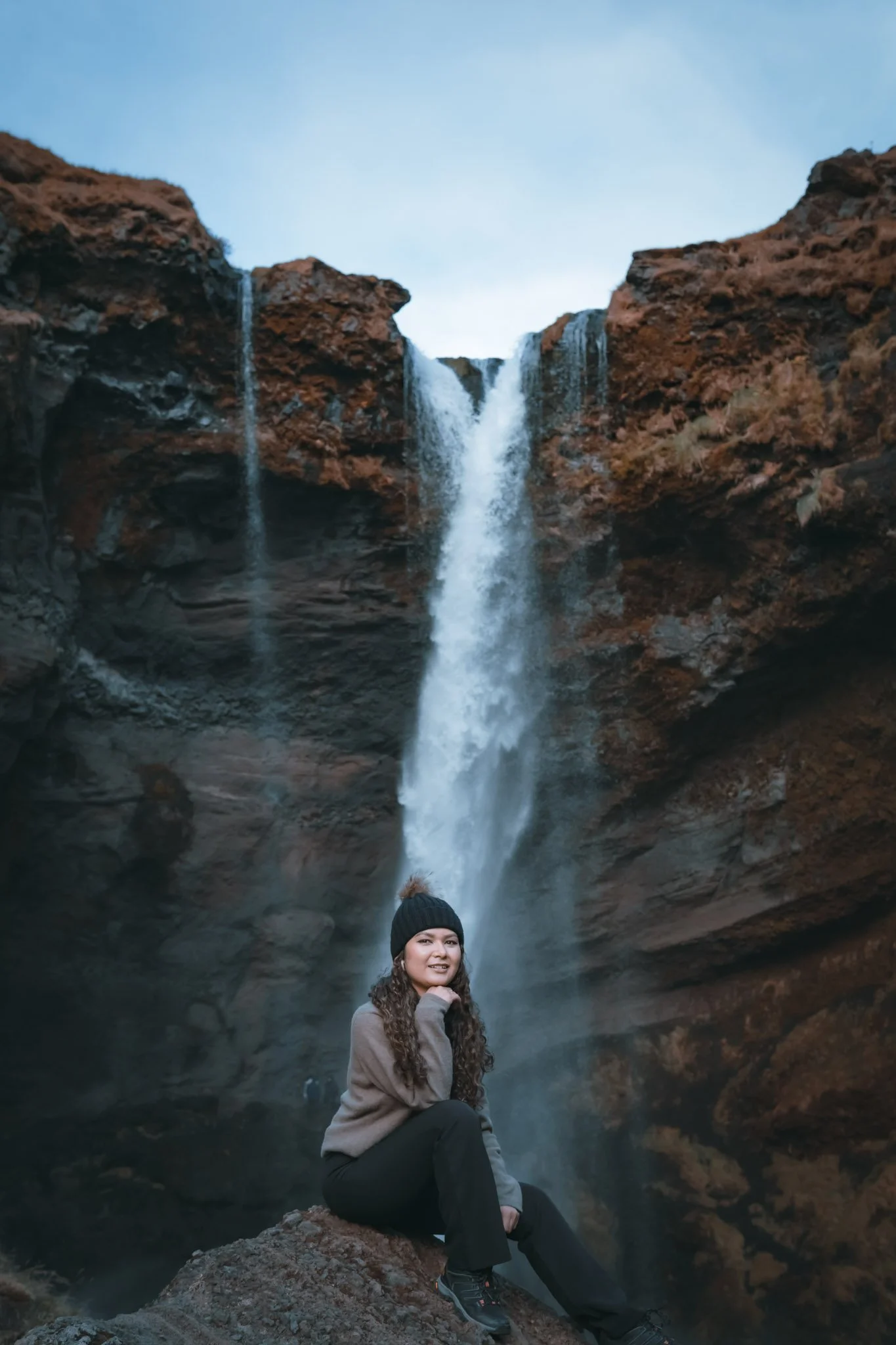 A woman sitting on a rock in front of a waterfall in a canyon, wearing a black beanie and brown sweater.