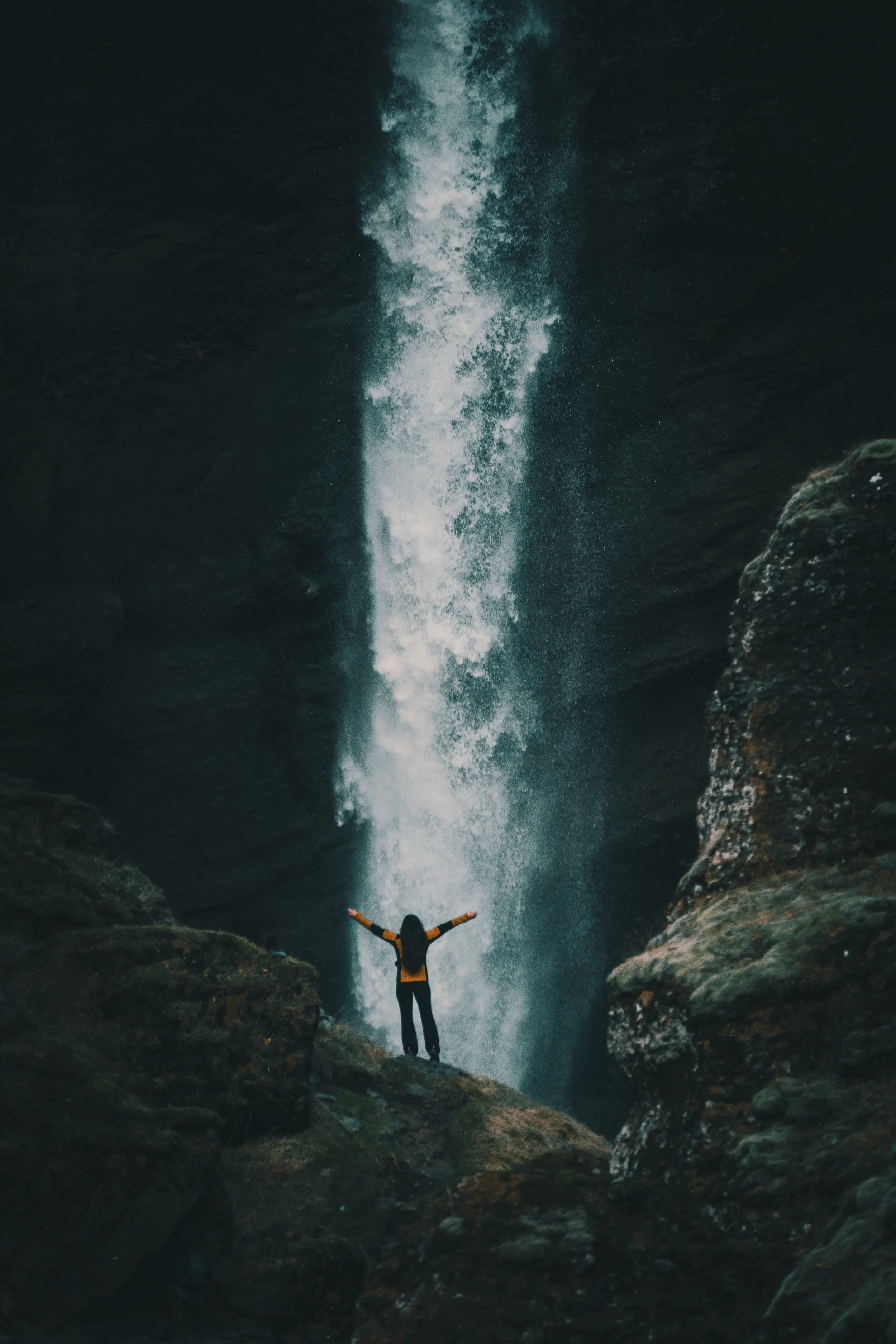 A person standing with arms raised near a waterfall surrounded by rocks.